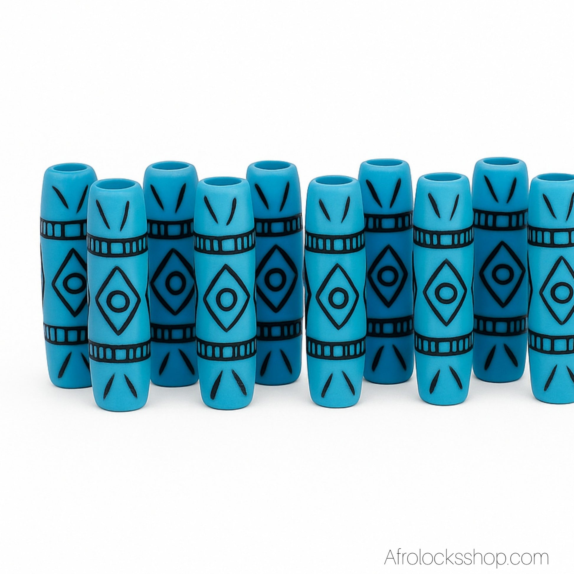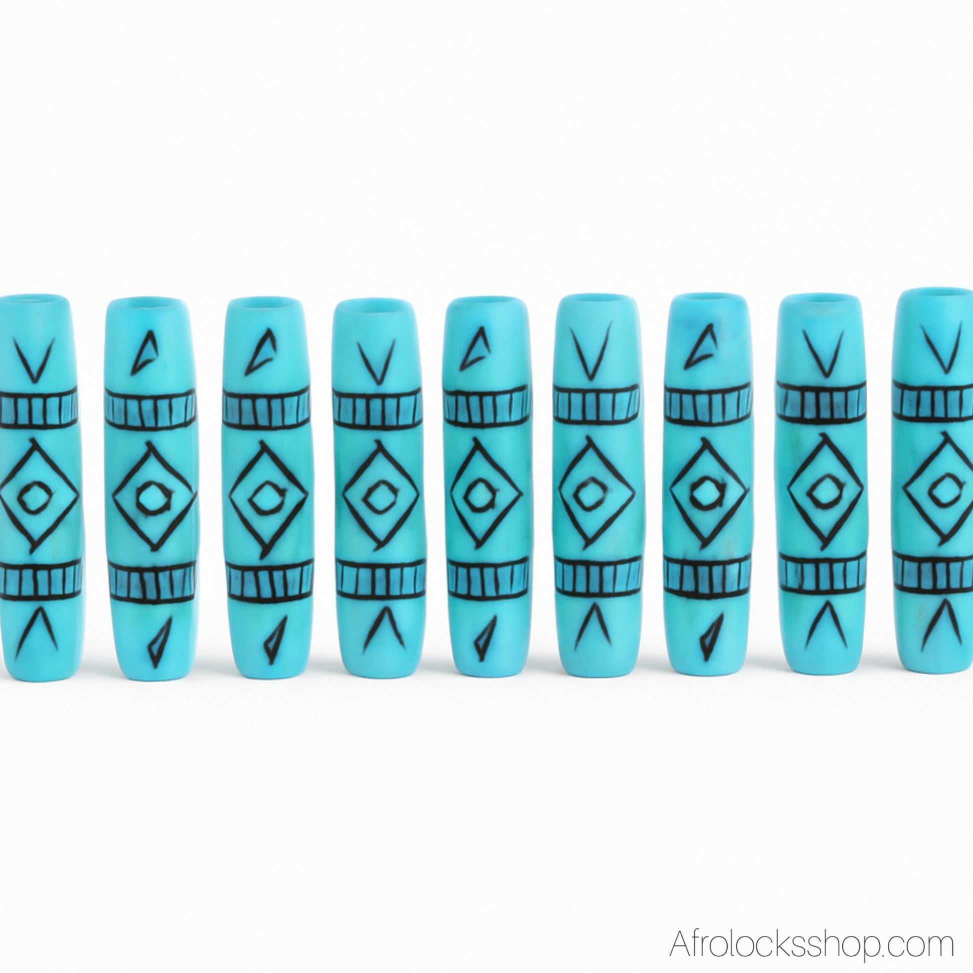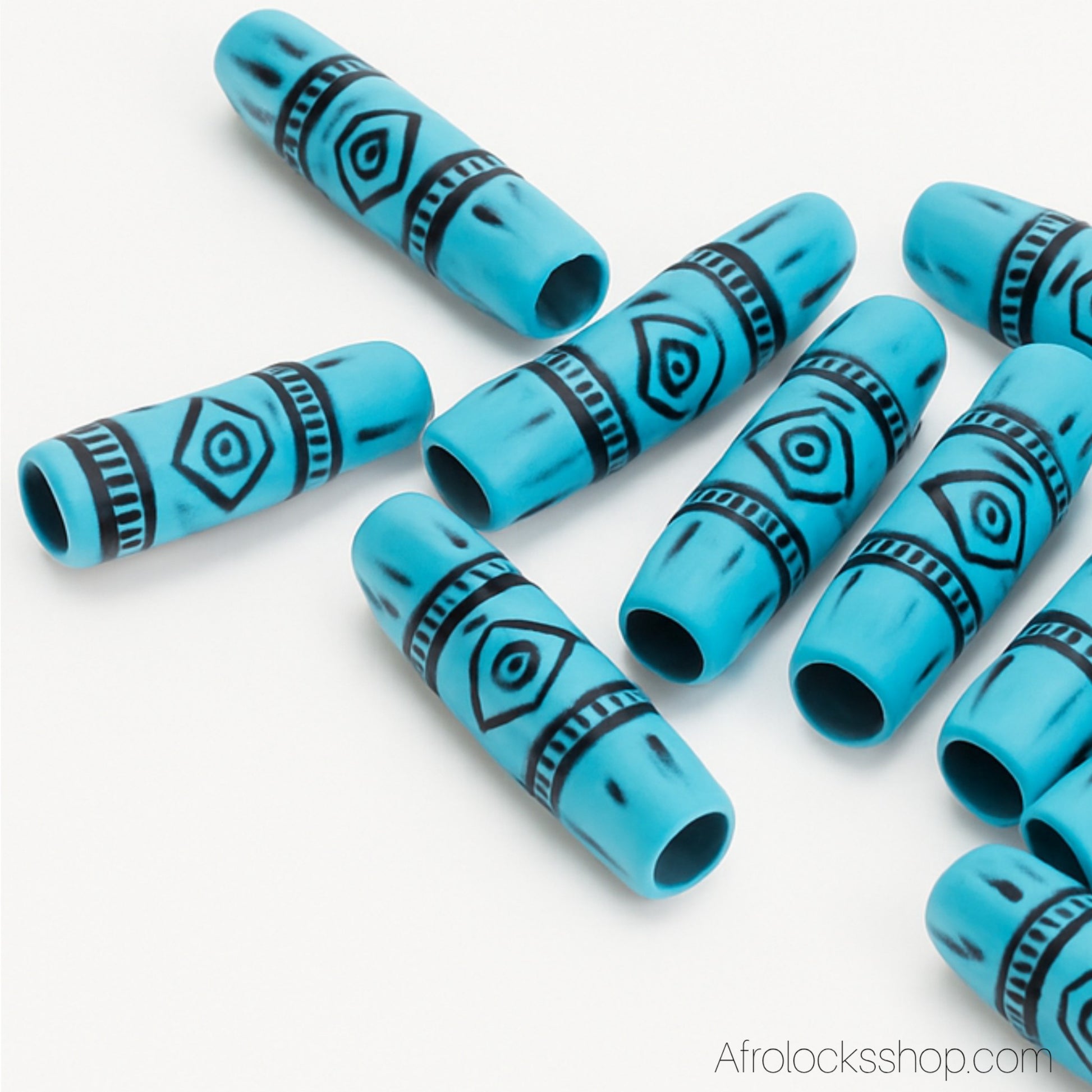 Ces perles longues en plastique bleu au motif ethnique noir sont parfaites pour décorer locks, tresses, vanilles… et même la barbe. Leur forme allongée (3,5 cm) met en valeur chaque mèche et tient bien en place grâce à un trou de 4 mm.