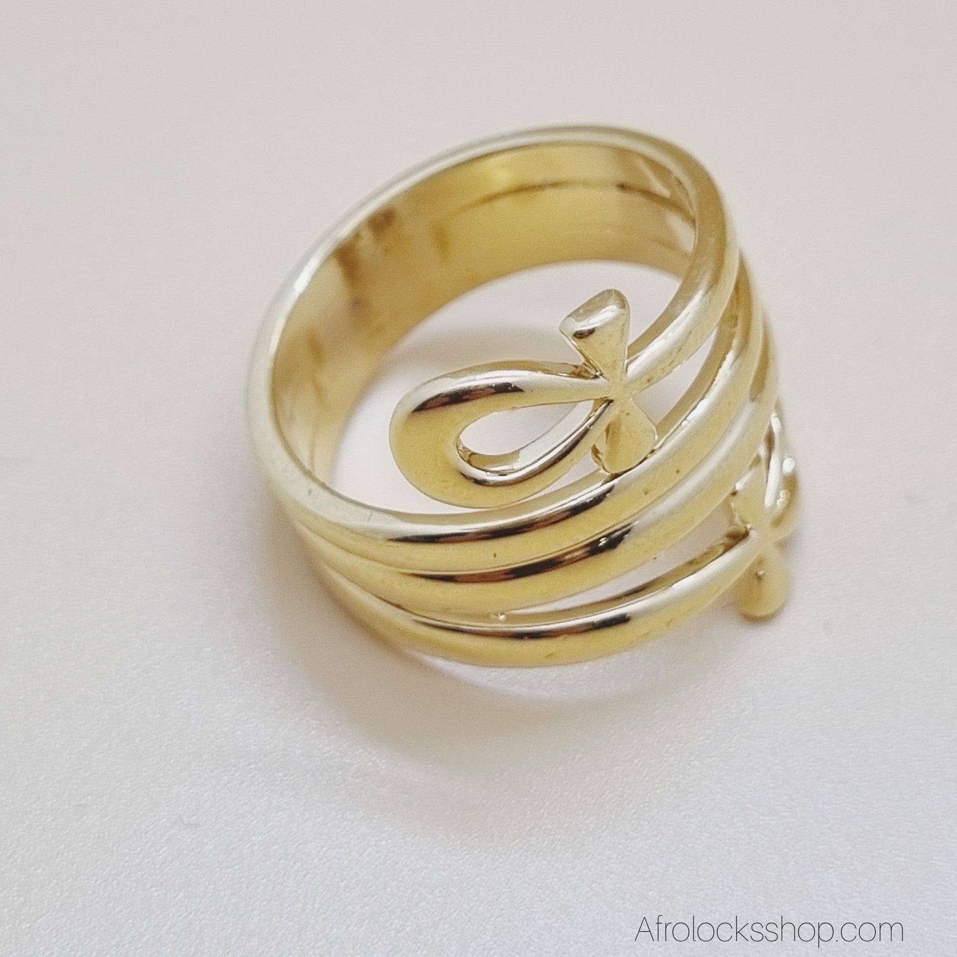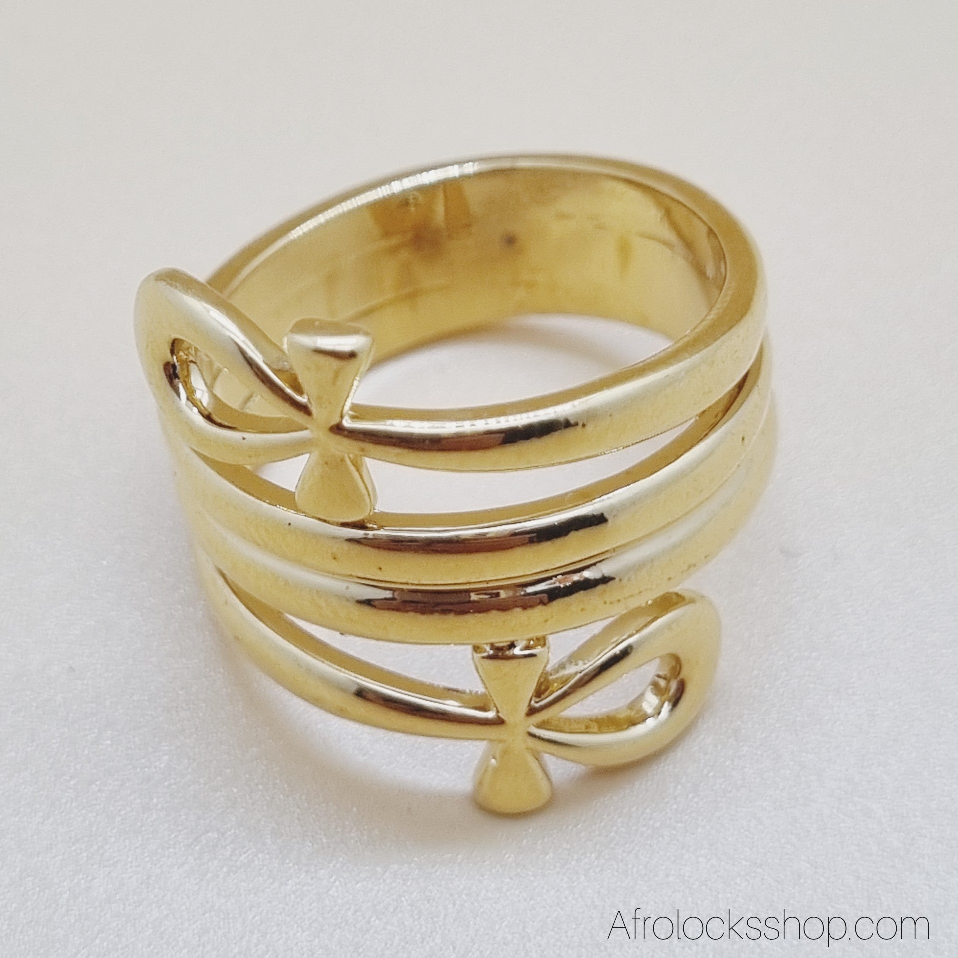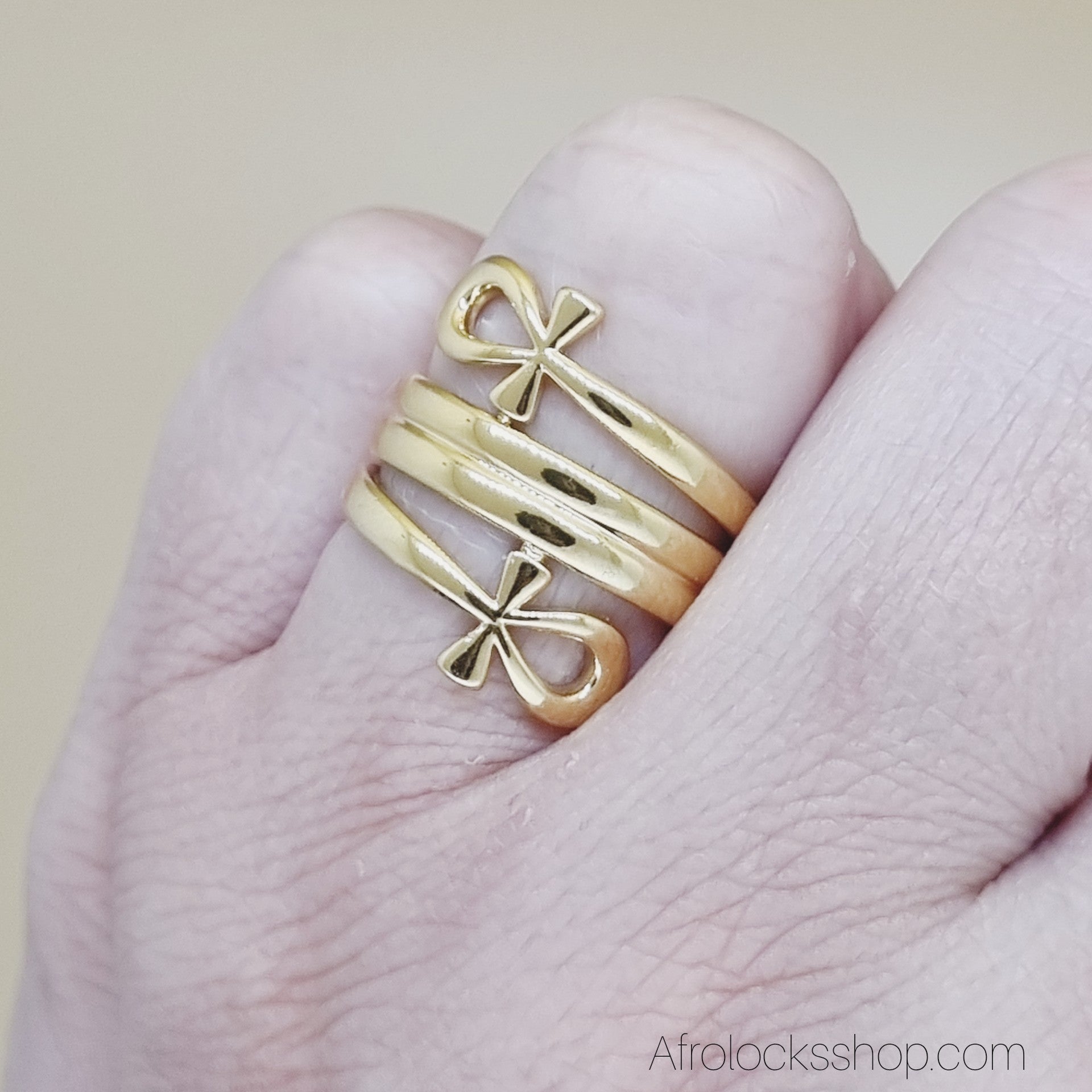 💛 Ankh – symbole de la vie. Bague en acier inoxydable doré avec deux croix d’Ankh intégrées au design triple anneau.