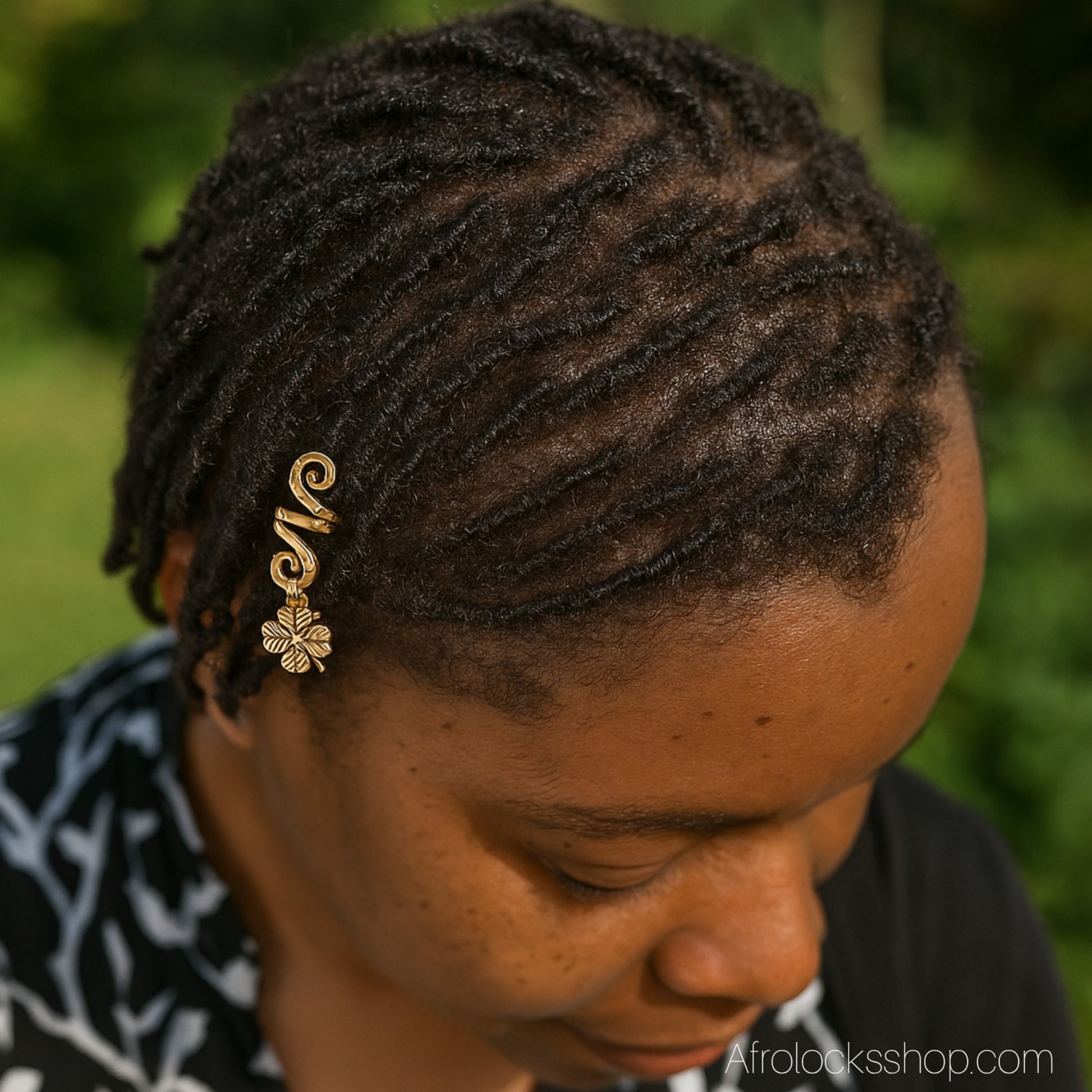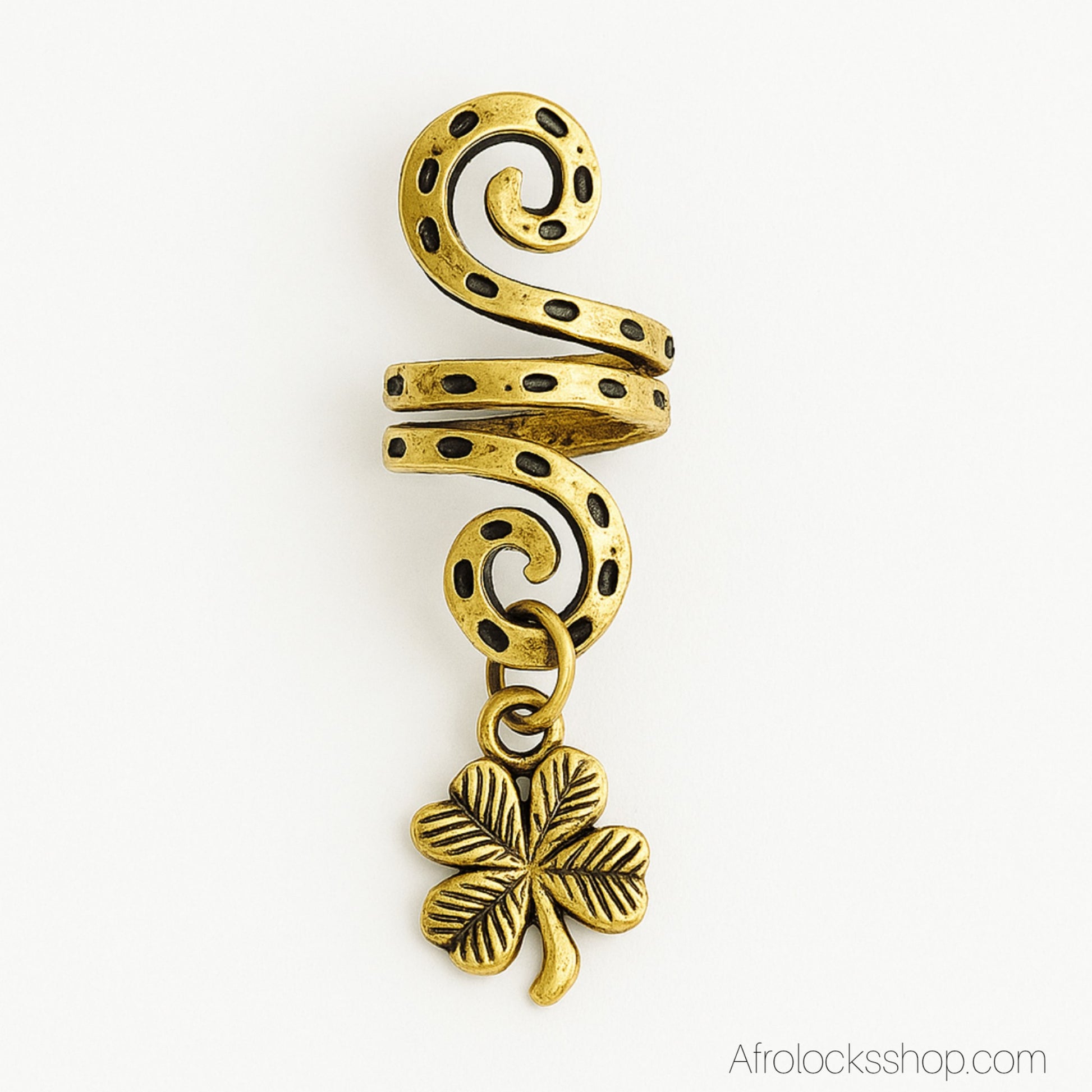 Chaque bijou se compose d’une spirale dorée à motif gravé, décorée d’un pendentif trèfle porte-bonheur. Léger et facile à poser, il glisse simplement sur la locks ou la tresse pour sublimer ta coiffure avec élégance.