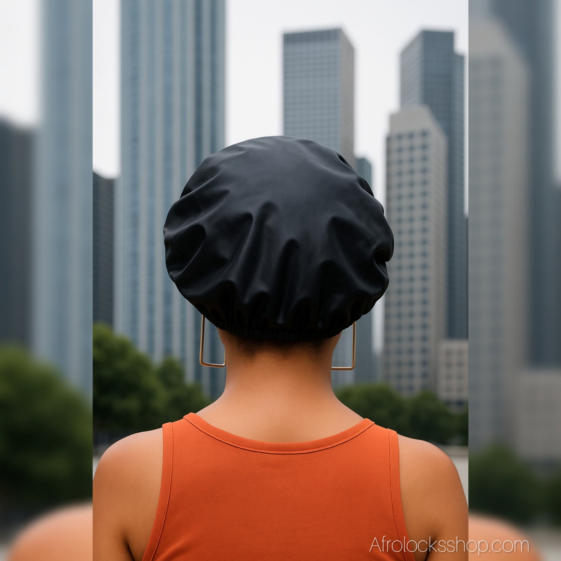 Ce bonnet en satin noir extensible accueille facilement les locks, tresses longues, cheveux afro ou curly volumineux.
