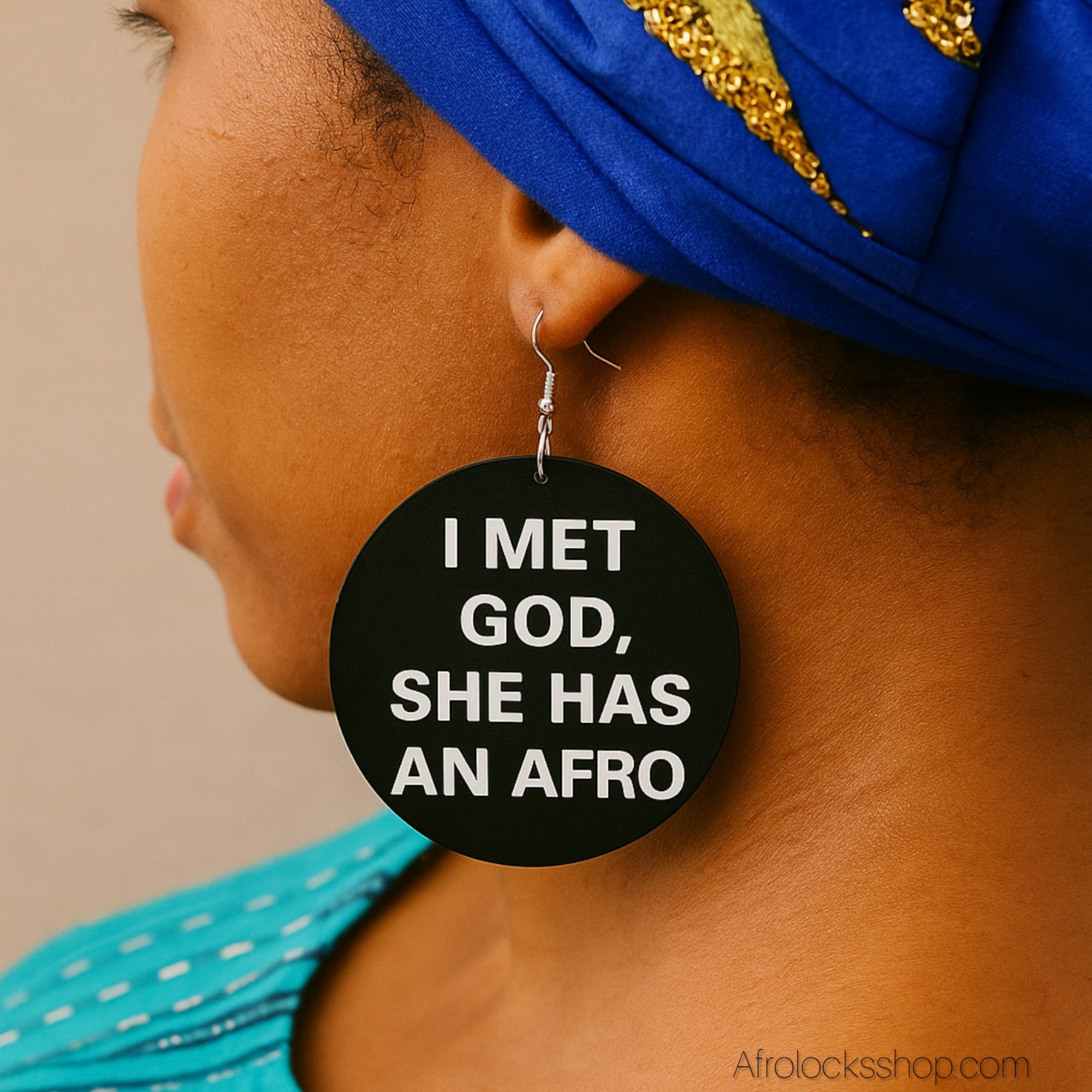 Grandes boucles en bois (Ø 6 cm). Recto : “I met God, she has an Afro”. Verso : noir uni. Ultra légères, look statement assuré sur toutes tes coiffures.