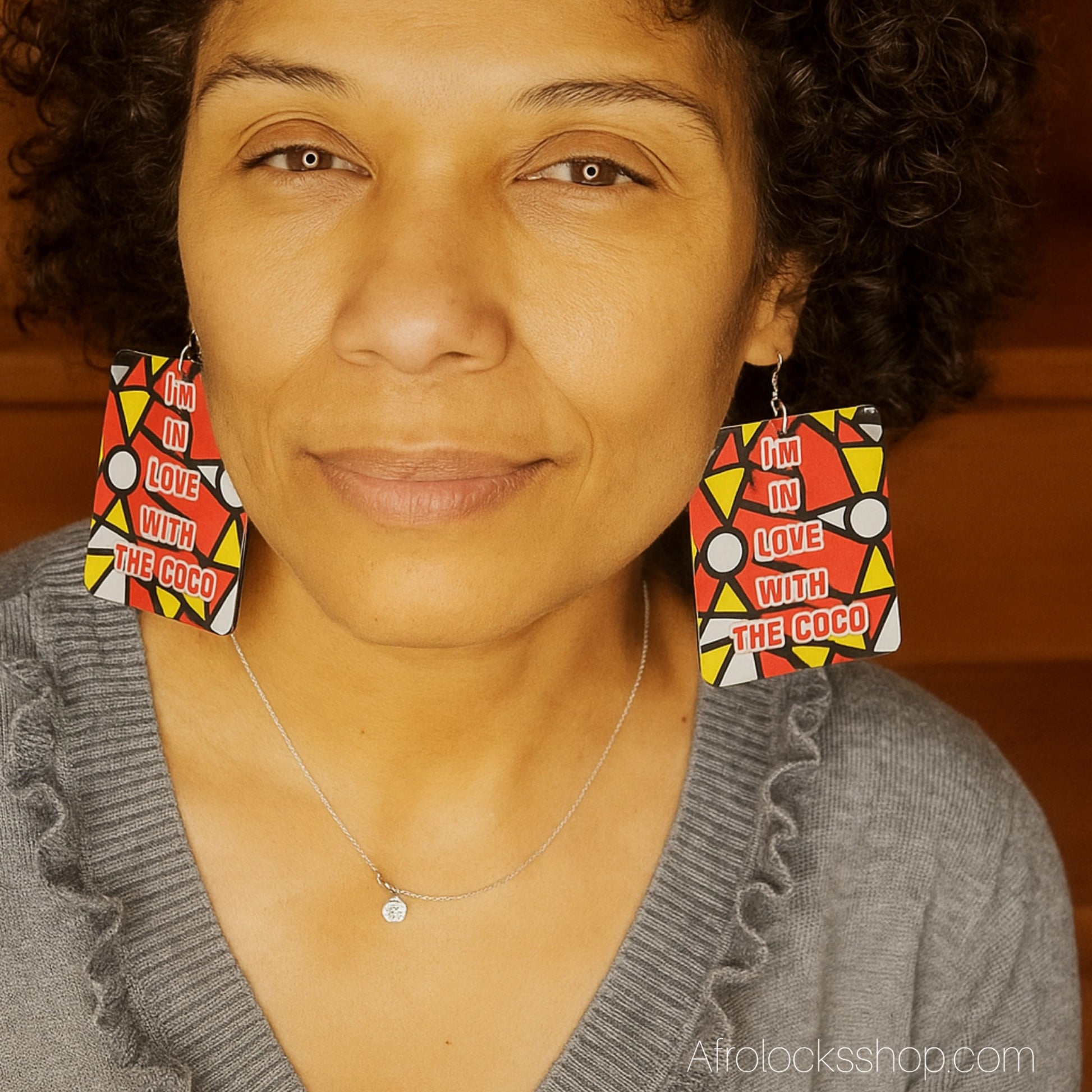 Boucles d’oreilles « I’m in love with the coconut oil » – wax – bois 6×5 cm – recto-verso – mini-séries
