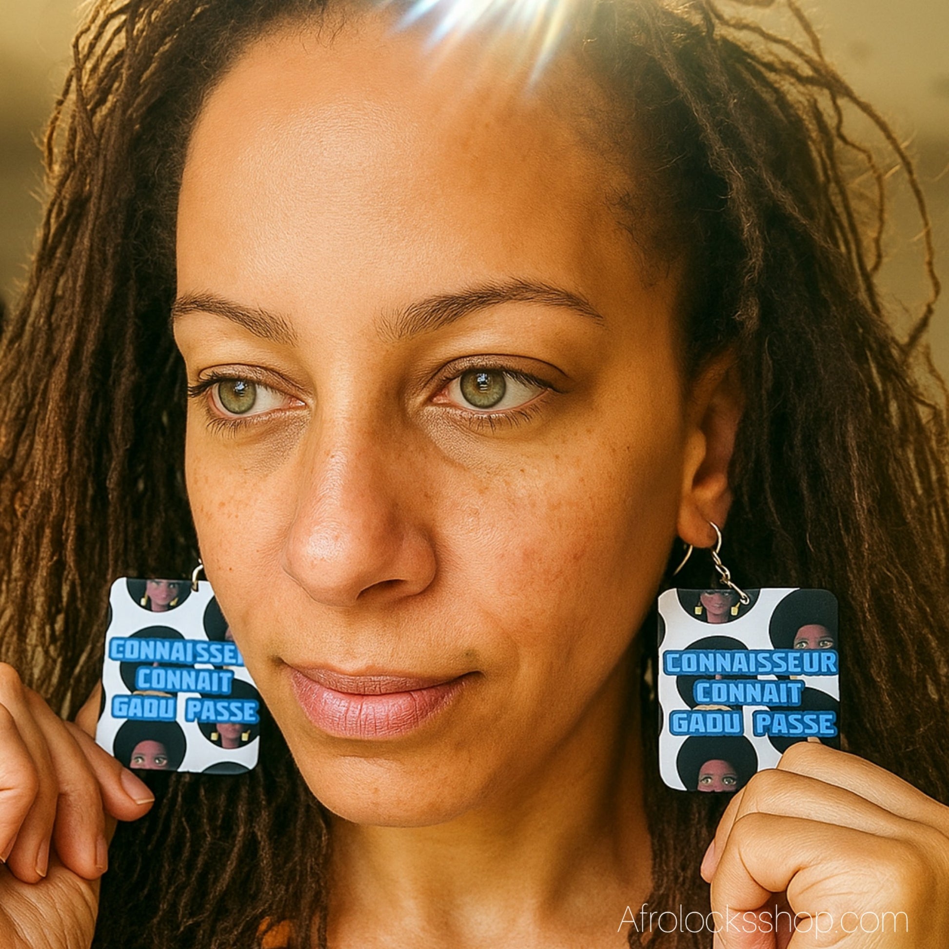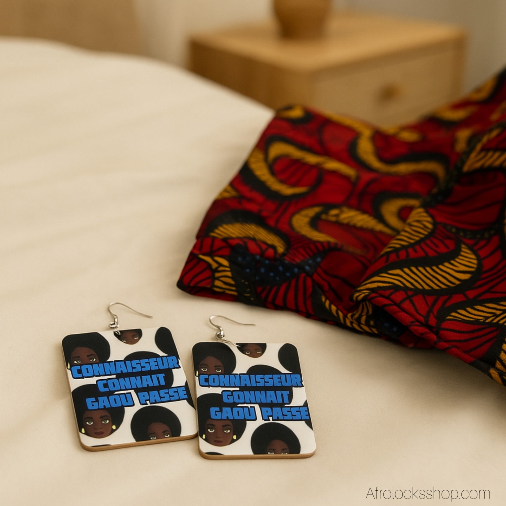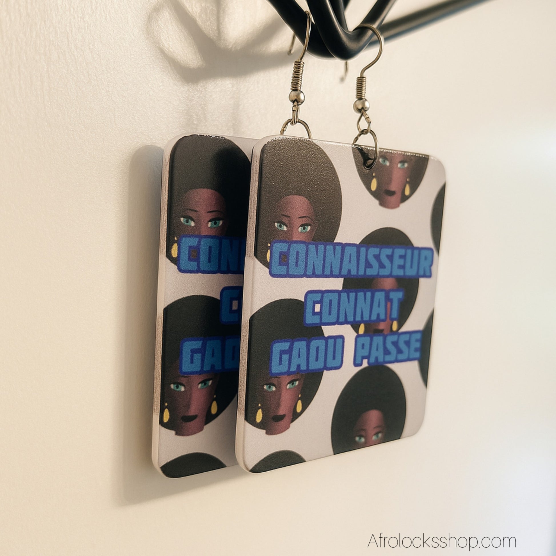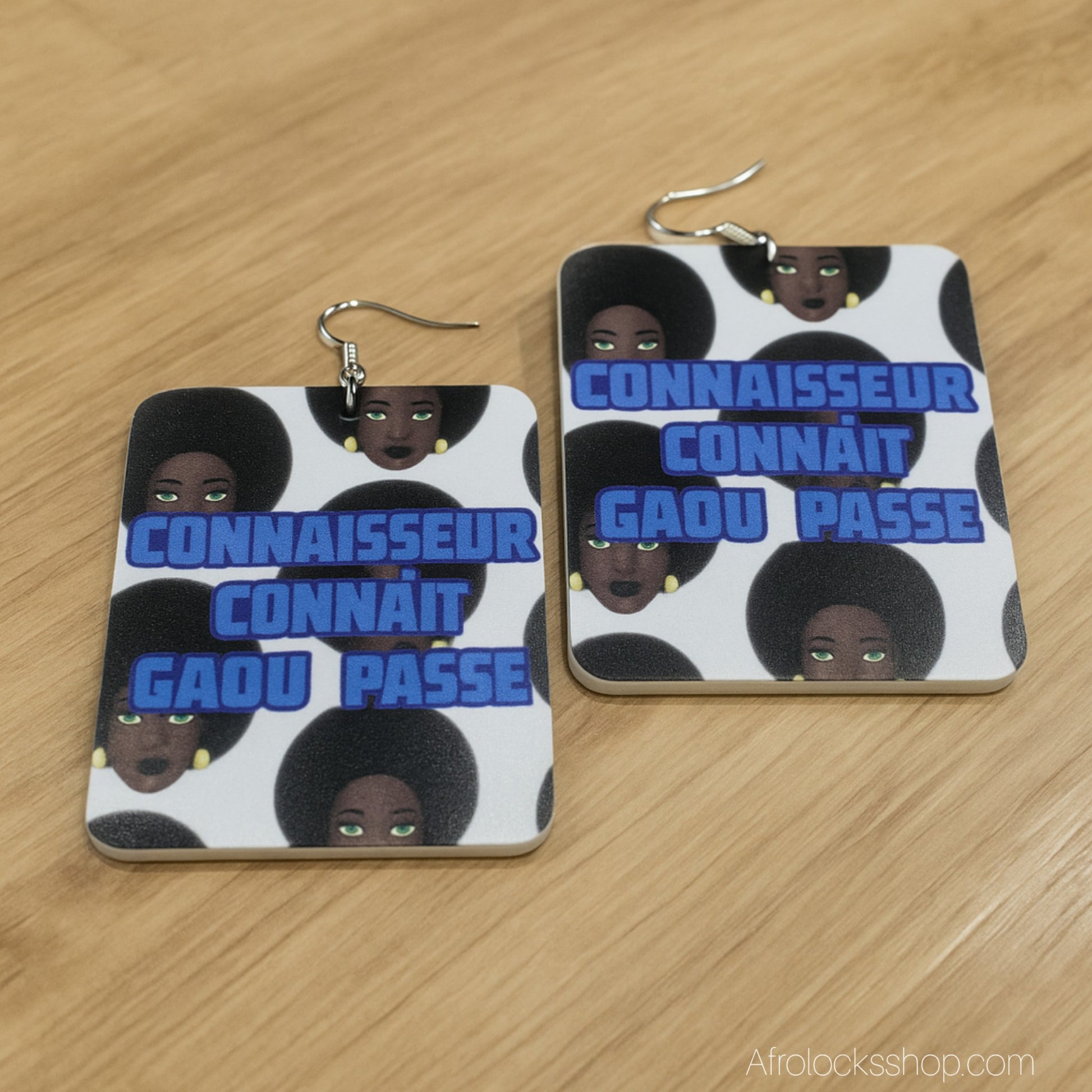 Boucles d’oreilles « Connaisseur connaît, gaou passe » – bois 6×5 cm – recto-verso – mini-séries