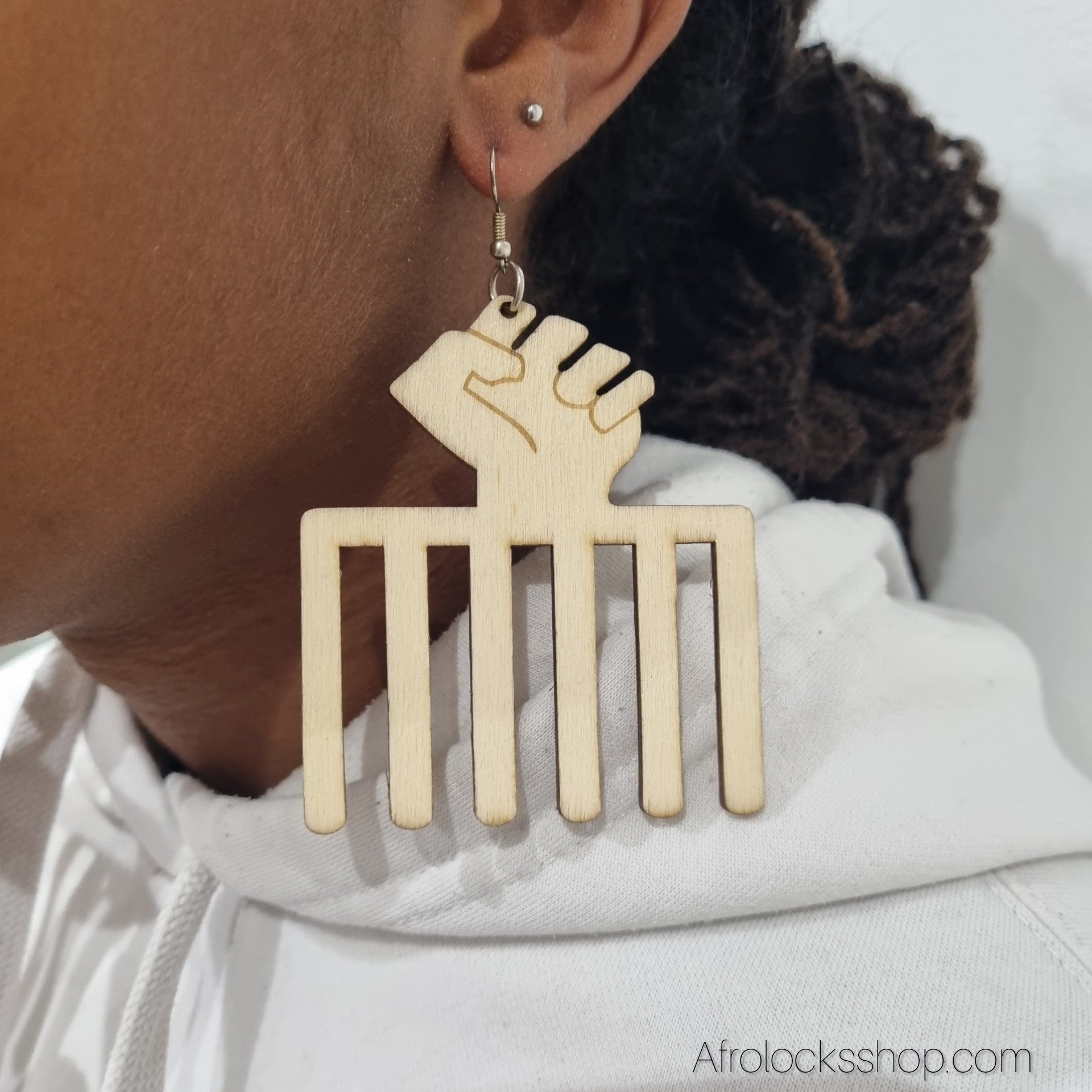 Affirme ton style afro-chic avec ces grandes boucles en bois représentant le peigne afro & poing levé ✊.