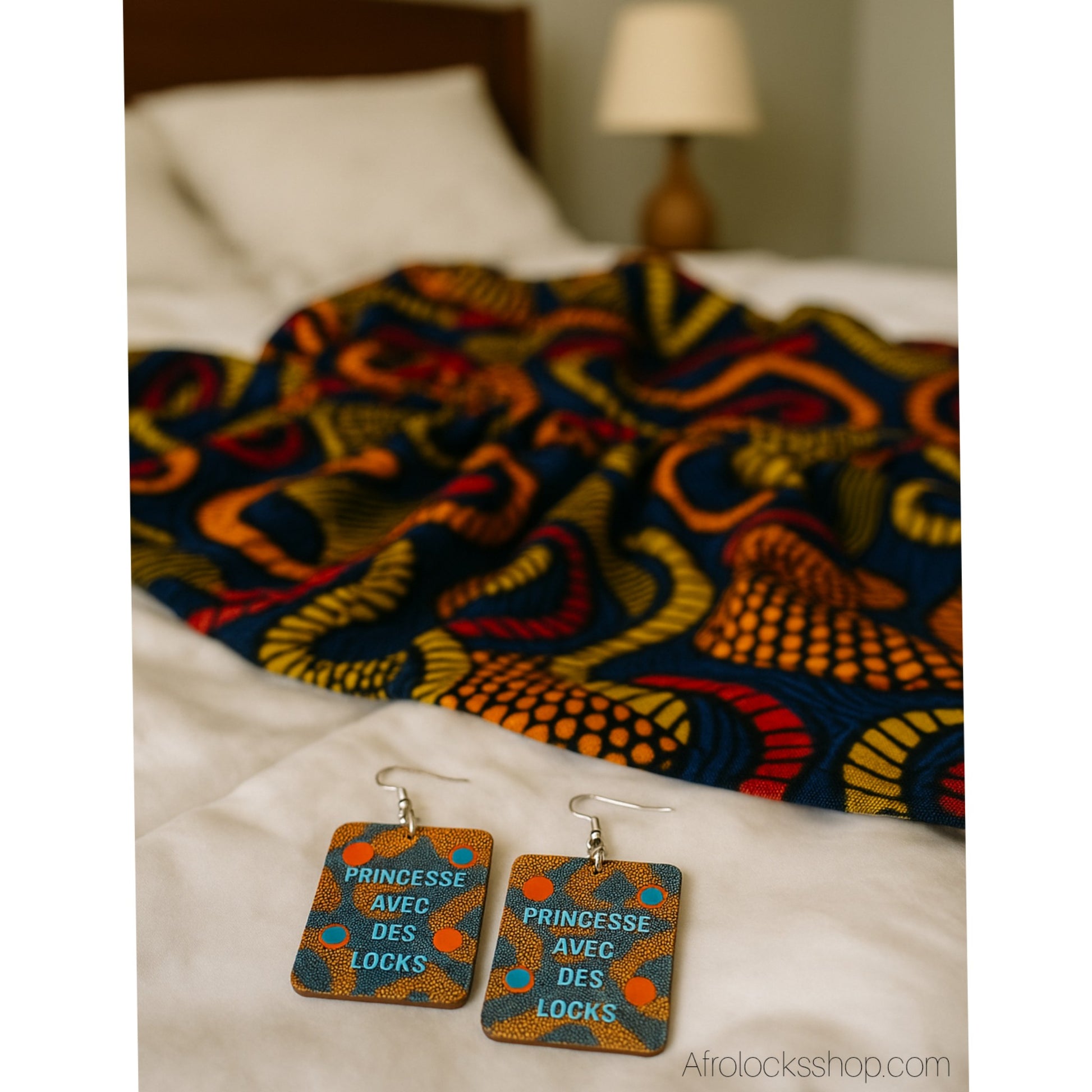 Boucles d’oreilles « Princesse avec des locks » – wax – bois 6×5 cm – recto-verso – mini-séries
