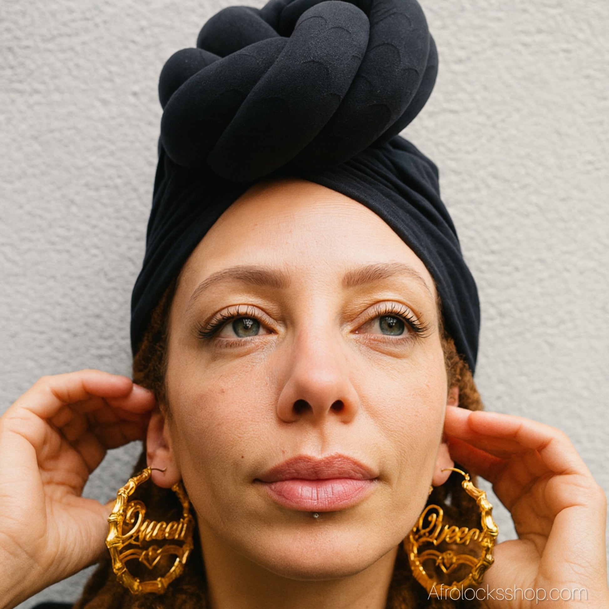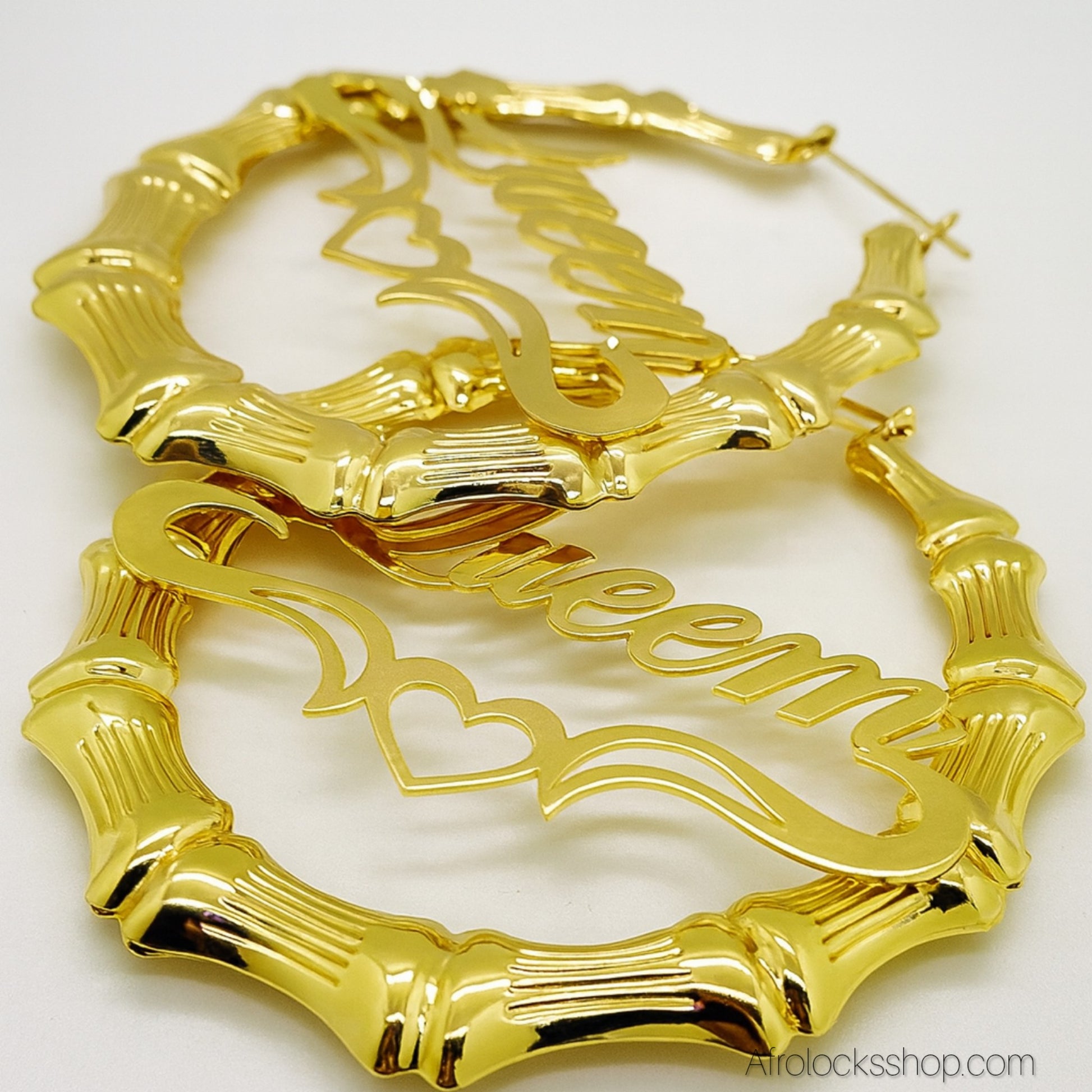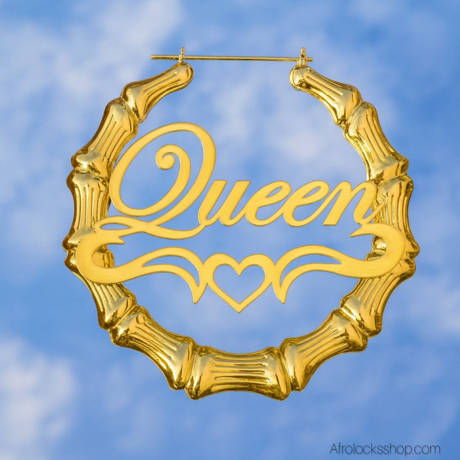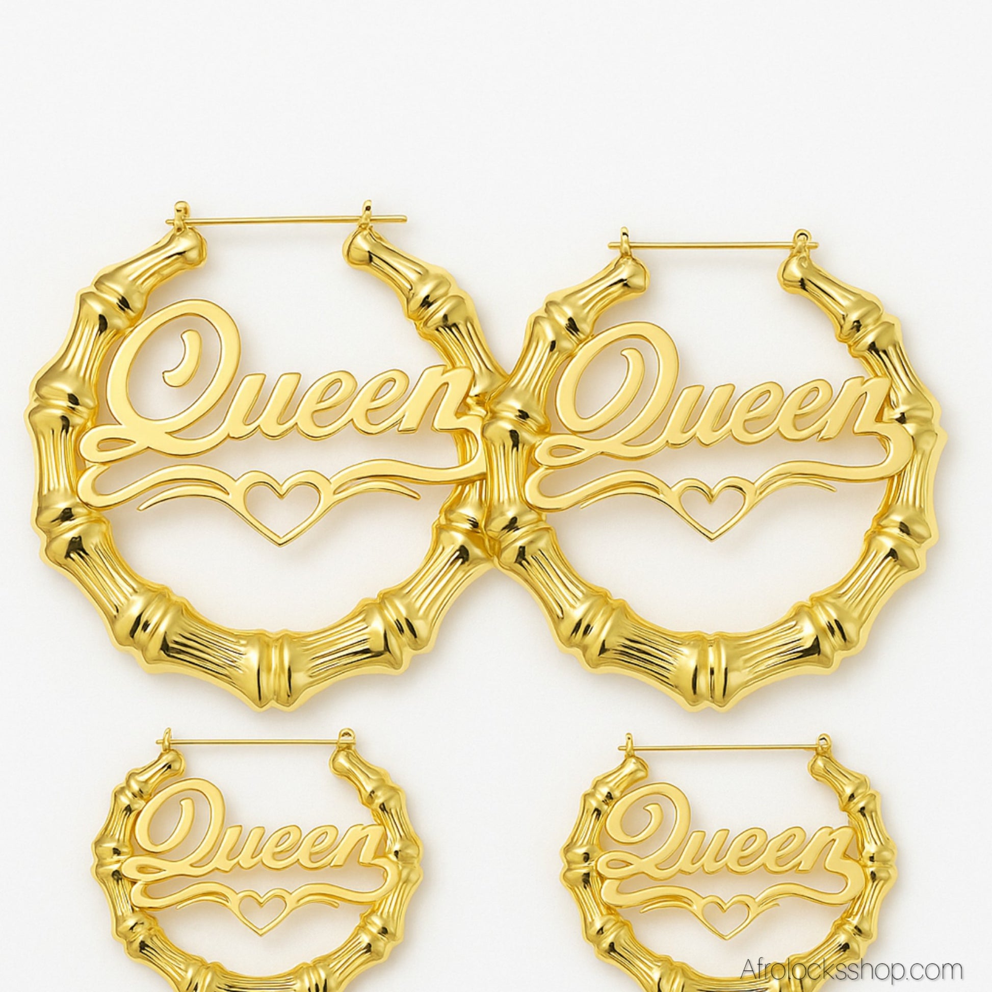 Créoles “bamboo hoops” plaqué or haute qualité, avec inscription Queen. Trois tailles pour tous les styles : discret, affirmé ou royal 👑