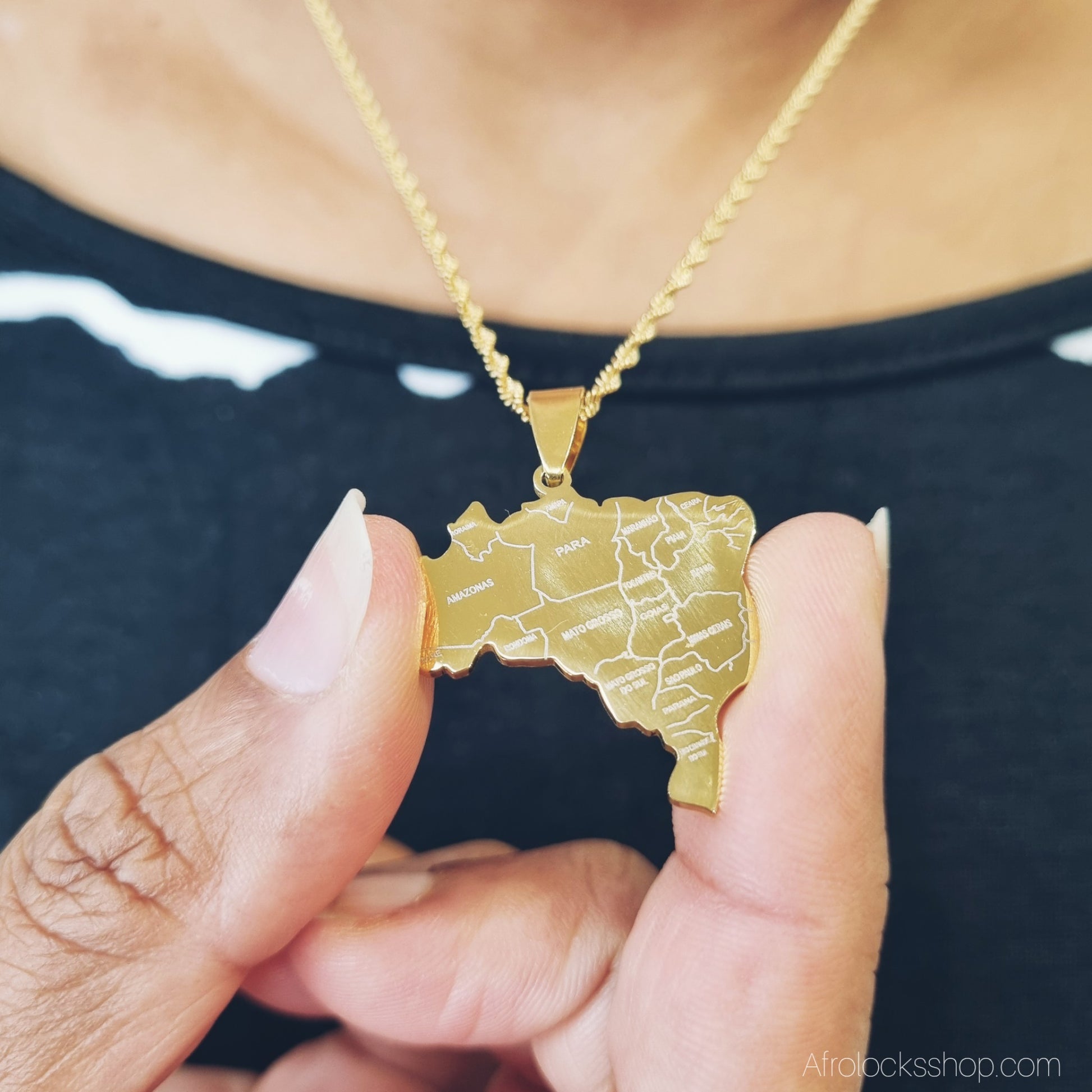 Collier carte du Brésil en acier inoxydable 316L (couleur or) avec pendentif gravé des États. Chaîne confortable 50 cm et fermoir mousqueton.