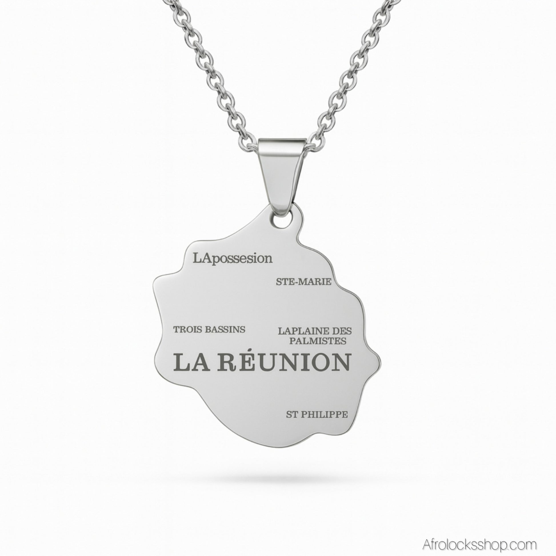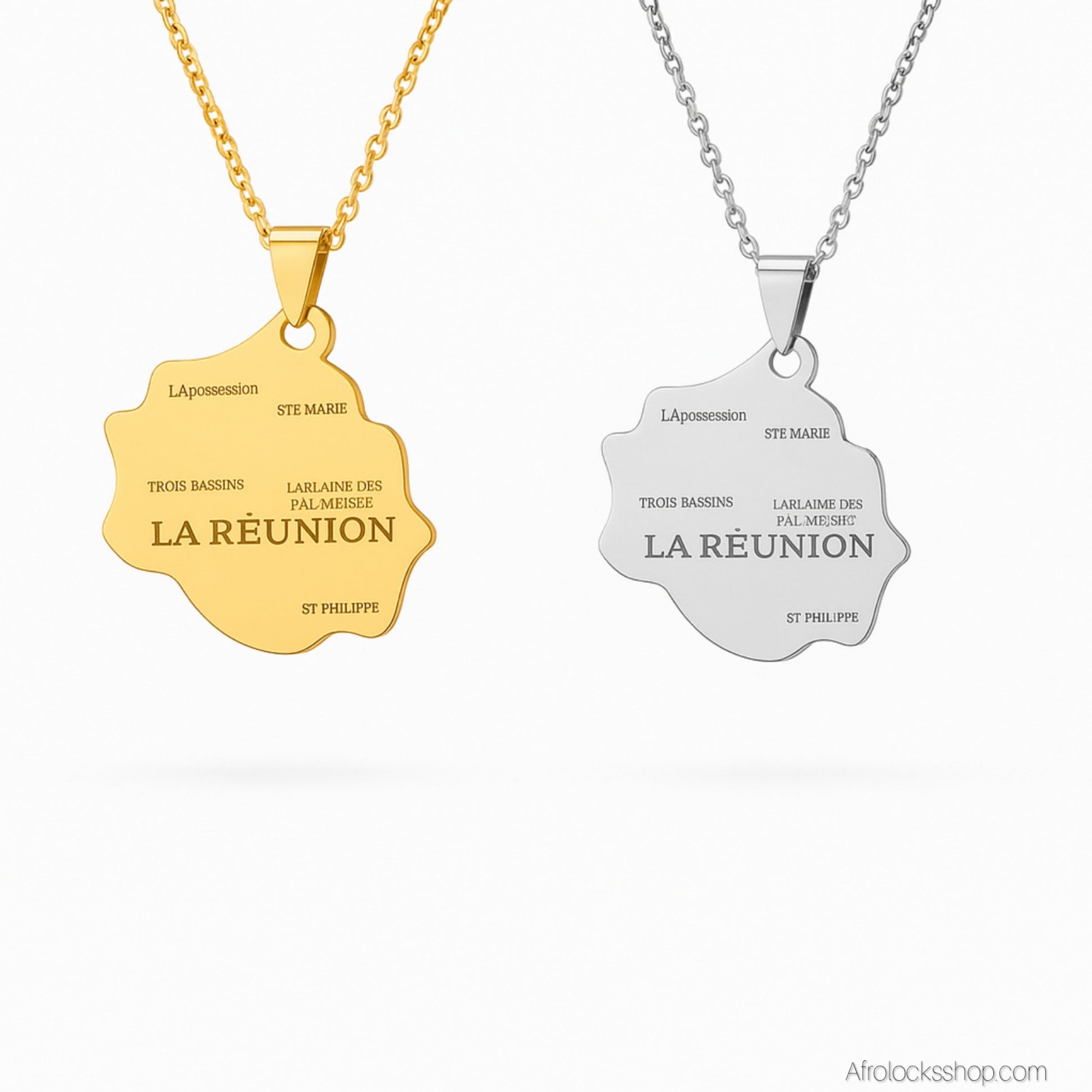 🌴 Collier carte « Île de La Réunion » – acier inox 316L – chaîne 50 cm – doré ou argenté