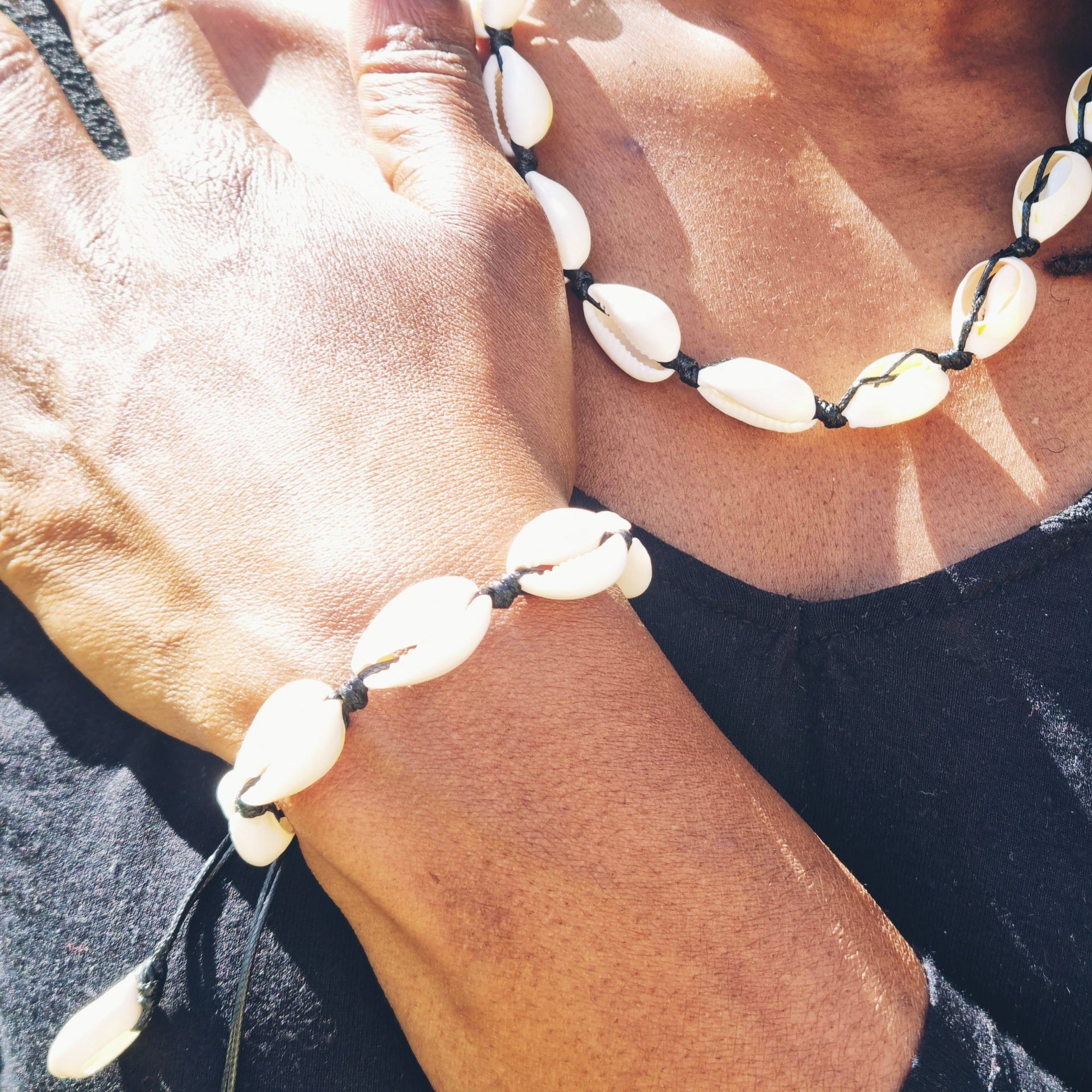 Cette parure associe un collier et un bracelet en cauris naturels noués sur cordon noir. Tailles ajustables, finition soignée, parfaits pour un style boho & afro chic.